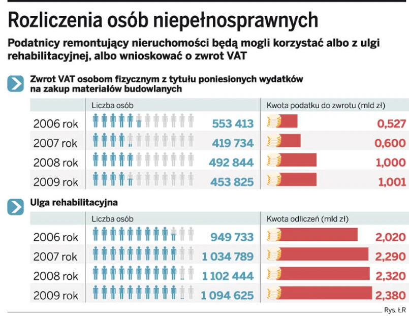 Podatnicy ponoszący wydatki na zakup materiałów budowlanych w związku z adaptacją (remontem) mieszkań do potrzeb niepełnosprawności mogą utracić podwójną preferencję podatkową, tj. możliwość odliczenia ulgi rehabilitacyjnej w PIT oraz uzyskania zwrotu VAT na materiały budowlane. Wprawdzie dziś otrzymanie takiego zwrotu zobowiązuje podatnika do pomniejszenia ulgi rehabilitacyjnej w zeznaniu podatkowym, jednak w praktyce przepis ten ma zastosowanie, gdy ulga odliczana jest za ten sam rok, w którym podatnik uzyskał zwrot. Biorąc pod uwagę, że wniosek o zwrot można składać w dowolnym czasie, a termin na dokonanie zwrotu do niedawna wynosił pół roku, a obecnie cztery miesiące, to w dużej części przypadków rok poniesienia wydatków na adaptację mieszkań nie pokrywa się z rokiem zwrotu VAT. W konsekwencji podatnik korzysta podwójnie. Zmianę tej sytuacji przewiduje projekt komisji Przyjazne Państwo. Modyfikuje on art. 45 ust. 3a ustawy o PIT, co skutkować będzie koniecznością doliczenia do dochodów kwoty otrzymanej ulgi, w przypadku gdy podatnik nawet w kolejnych latach otrzyma zwrot VAT z tytułu poniesienia wydatków na zakup tych samych materiałów budowanych.