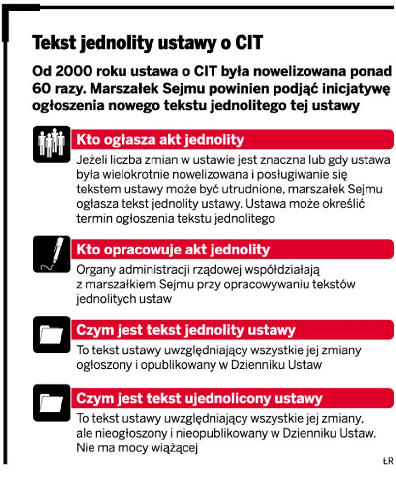 Ostatni tekst jednolity przepisów ustawy o CIT został ogłoszony w 2000 roku. Przez ostatnie 10 lat ustawa o CIT była zmieniana blisko 60 razy. Marszałek Sejmu powinien ogłosić jak najszybciej nowy tekst jednolity.