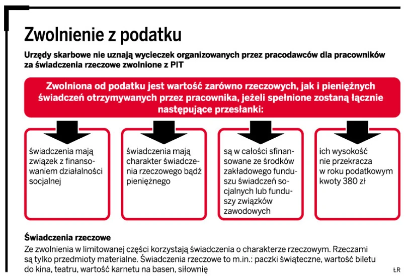 Ze zwolnienia w limitowanej części korzystają jedynie świadczenia pieniężne oraz świadczenia o charakterze rzeczowym. Natomiast nie można uznać, że wartość wycieczki obejmująca np. koszty przewozu, opłaty przewodnika, koszty ubezpieczenia jest świadczeniem rzeczowym, bowiem uczestnicy wycieczki nie otrzymują świadczenia o charakterze materialnym, tj. rzeczowym. Przedmiotem świadczenia jest usługa turystyczna, a nie rzecz. Wartość takiego świadczenia stanowi przychód pracownika podlegający opodatkowaniu podatkiem dochodowym od osób fizycznych jako przychody ze stosunku pracy.