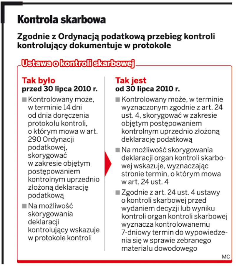 Po ostatnich zmianach ustawa o kontroli skarbowej nie zawiera już bezpośrednich regulacji dotyczących udokumentowania kontroli podatkowej prowadzonej przez organy kontroli skarbowej w formie protokołu kontroli. Do tej pory takie regulacje zawierał art. 14c ustawy dający podatnikowi prawo do skorygowania deklaracji w terminie 14 dni od dnia doręczenia protokołu kontroli.