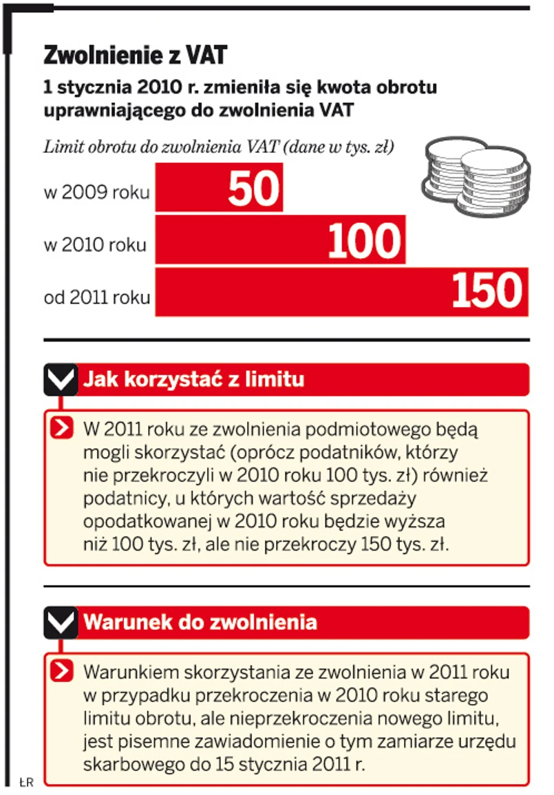 Ustawa o VAT (Dz.U. z 2004 r. nr 54, poz. 535 z późn. zm.) przewiduje zwolnienie z podatku przedsiębiorców, u których wartość sprzedaży nie przekracza określonego w niej limitu. Radosław Pietrzak, menedżer w Deloitte, podaje, że przez długi czas była to równowartość 10 tys. euro, która następnie została zamieniona na 50 tys. zł.