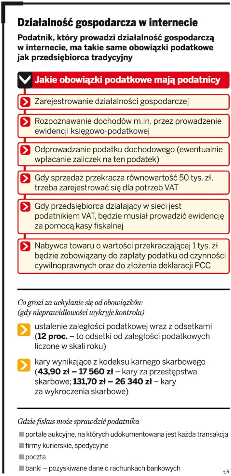 Aktywność osób oferujących i sprzedających towary na portalach aukcyjnych jest monitorowana przez służby ministra finansów. Ustawa o kontroli skarbowej daje podstawy do ustalenia danych pozwalających na identyfikację osób prowadzących tego rodzaju działalność, w tym również tych osób, które posługują się wyłącznie numerem telefonu, a transakcję finalizują przez pocztę elektroniczną. Jeśli ilość i wartość oferowanych towarów wskazują, że dana osoba prowadzi działalność gospodarczą, mogą zostać wszczęte wobec niej postępowanie podatkowe lub kontrola skarbowa. W szczególnych przepadkach może zostać zastosowana procedura kontroli z nieujawnionych źródeł przychodu. Zgodnie z ustawą o podatku dochodowym od osób fizycznych stawka podatku w takim przypadku wynosi 75 proc. dochodu.