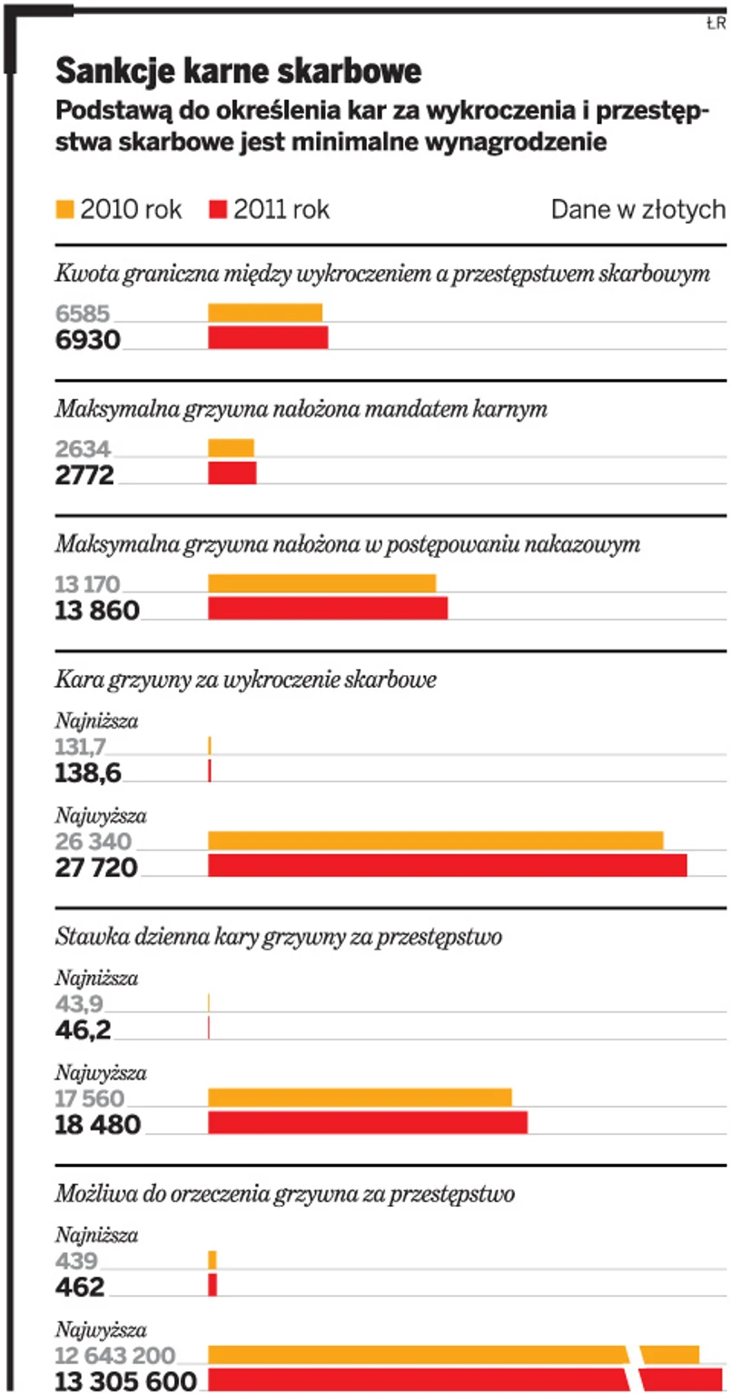 Mimo że wysokość kary grzywny za wykroczenia i przestępstwa skarbowe uzależniona jest od wysokości minimalnego wynagrodzenia (a to od 2011 r. wzrośnie o 69 zł), to jednak wydaje się mało prawdopodobne, by wzrost ten istotnie wpłynął na wysokość kar nakładanych w związku z niedopełnieniem obowiązków wynikających z prawa podatkowego. Takiego zdania jest Lesław Mazur, menedżer w Ernst & Young, który wskazuje, że wysokość kary grzywny za wykroczenia i przestępstwa skarbowe jest i nadal będzie uzależniona od stosunków majątkowych oraz rodzinnych sprawcy, np. wartości posiadanego majątku, liczby dzieci na utrzymaniu itp., czy też jego dochodów i możliwości zarobkowych (a te nie zmienią się przecież wraz ze wzrostem minimalnego wynagrodzenia).