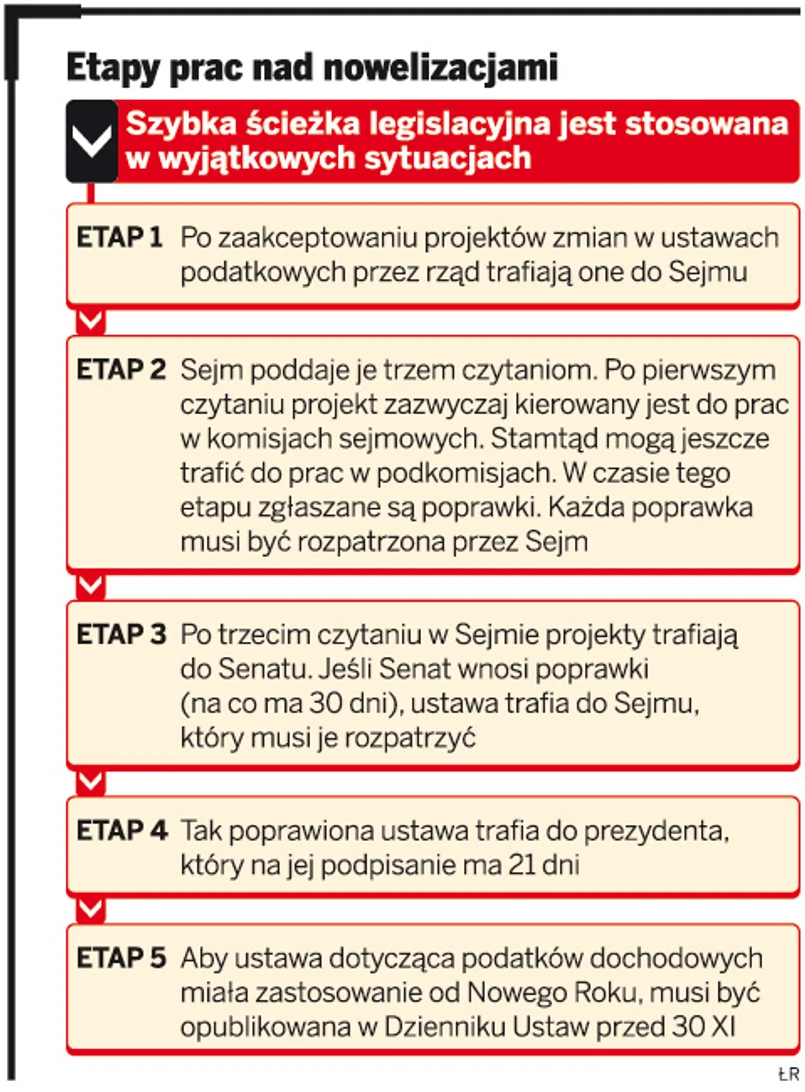 Praktycznie co roku jesienią jesteśmy świadkami legislacyjnego wyścigu podatkowego. Jest to wyścig z czasem. Podobnie jest i w tym roku. Mimo że projekty nowelizujące ustawy o podatku dochodowym od osób fizycznych oraz o podatku dochodowym od osób prawnych były opublikowane przez Ministerstwo Finansów na wiosnę, prace parlamentarne nad nimi nabrały tempa dopiero teraz.