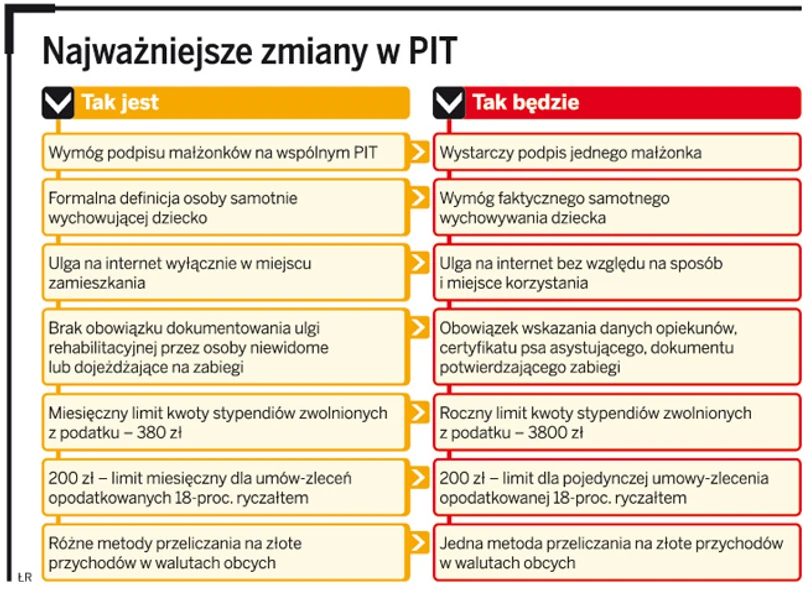 Parlament zakończył prace na nowelizacją ustawy o PIT powstałą ze współpracy komisji Przyjazne Państwo i Ministerstwa Finansów. Teraz ustawa trafi na biurko prezydenta. Większość rozwiązań jest korzystna, jednak nie ze wszystkich ucieszą się podatnicy. Zmiany – poza zniesieniem wymogu dwóch podpisów na zeznaniu małżonków – będą miały zastosowanie do dochodów za 2011 rok.