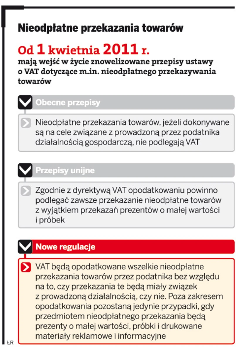 Jerzy Martini, doradca podatkowy w Baker & McKenzie, zauważa, że w praktyce powszechnie przyjęło się (co potwierdza jednolita linia orzecznicza sądów administracyjnych), że nieodpłatne wydanie towarów związane z prowadzeniem przedsiębiorstwa nie podlega VAT. Projekt nowelizacji wskazuje natomiast, że również w takim przypadku nieodpłatne wydanie towarów powinno podlegać opodatkowaniu.