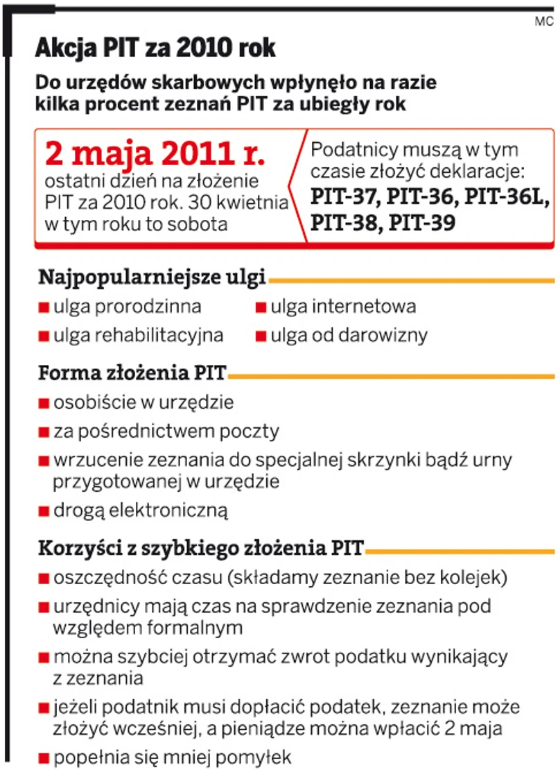PIT za 2010 rok jeszcze nie sparaliżowały pracy urzędów skarbowych. Do tej pory podatnicy złożyli kilka procent ze spodziewanych zeznań. Oto kilka przykładów. Urzędy woj. łódzkiego otrzymały w styczniu 13 644 zeznania (tj. ok. 1,5 proc. spodziewanych). Na terenie woj. śląskiego złożono na razie ok. 80 tys. zeznań (PIT-28, PIT-36, PIT-36L, PIT-37, PIT-38 i PIT-39). W tej liczbie największą grupę, ok. 65 tys., stanowią PIT-28.