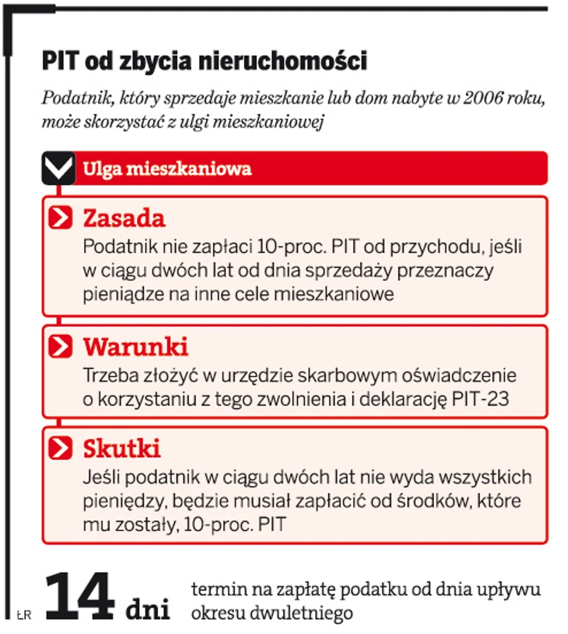 Prawo do zwolnienia przychodów ze sprzedaży nieruchomości nabytej przed końcem 2006 r. przysługuje, jeżeli przychody te w ciągu 2 lat od dnia sprzedaży zostaną przeznaczone na cele mieszkaniowe bądź też na spłatę kredytu zaciągniętego na te cele. Z rozliczeniem przychodów ze sprzedaży będziemy mieli do czynienia, tylko gdy nieruchomość została sprzedana w ciągu pięciu lat od zakupu. Oznacza to, że przychód z nieruchomości kupionej w 2006 roku a sprzedanej w tym roku będzie rozliczany do celów podatkowych. Gdyby została ona sprzedana w przyszłym roku, nie trzeba by jej rozliczać w PIT.