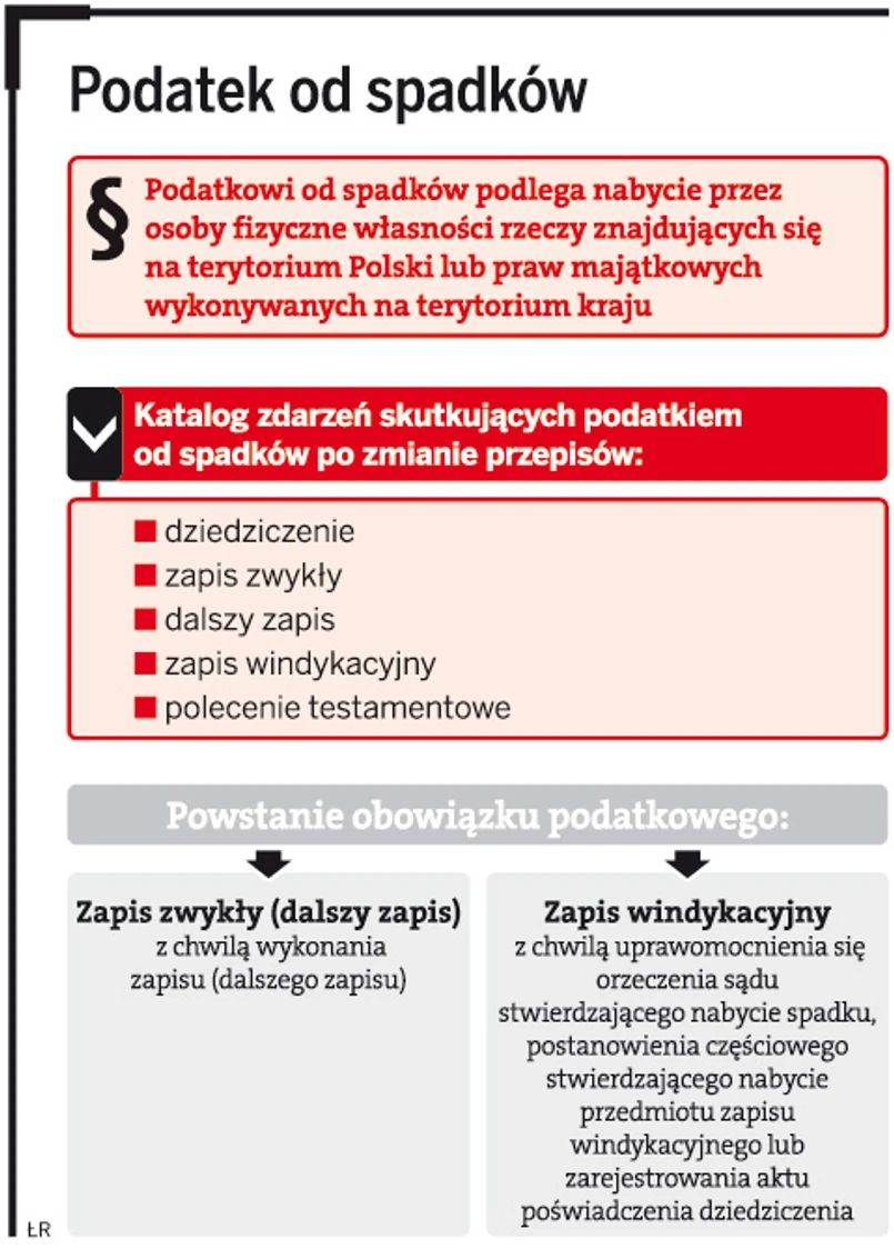 Przy zapisie zwykłym obowiązek podatkowy powstaje dopiero z chwilą jego wykonania. Natomiast przy nabyciu w drodze zapisu windykacyjnego obowiązek podatkowy powstanie z chwilą uprawomocnienia się orzeczenia sądu stwierdzającego nabycie spadku, postanowienia częściowego stwierdzającego nabycie przedmiotu zapisu windykacyjnego lub zarejestrowania aktu poświadczenia dziedziczenia.