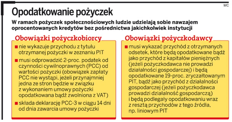 Udzielanie pożyczek w ramach portali społecznościowych może rodzić konsekwencje zarówno dla pożyczkodawcy, jak i pożyczkobiorcy. Paweł Jabłonowski, doradca podatkowy w Chałas i Wspólnicy Kancelarii Prawnej, podkreśla, że przy założeniu, iż pożyczkodawca okazjonalnie udziela tego typu pożyczek i nie można uznać, że prowadzi on w tym zakresie profesjonalną działalność usługową, nie będzie on uznany za podatnika VAT. Jednak w konsekwencji tego typu pożyczka będzie podlegała podatkowi od czynności cywilnoprawnych i będzie opodatkowana tym podatkiem, jeżeli wzięcie pożyczki od jednej osoby przekroczy 5 tys. zł i 25 tys. zł od wielu podmiotów. Te limity liczone są w okresach trzech kolejnych lat kalendarzowych.