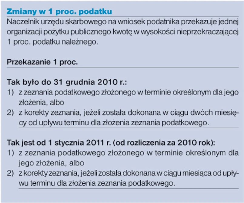 1 września 2010 r. weszły w życie znowelizowane przepisy ustawy o działalności pożytku publicznego i wolontariacie oraz innych ustaw. Zmieniły one też regulacje ustaw podatkowych dotyczące przekazywania 1 proc. podatku dla organizacji pożytku publicznego. Nowe zasady mają zastosowanie po raz pierwszy w rozliczeniu za ubiegły rok.