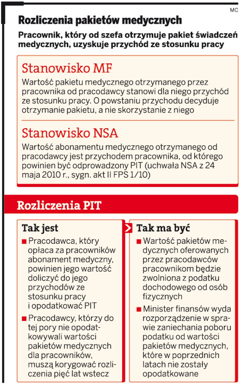 To nie koniec zmian podatkowych dotyczących pakietów medycznych. NSA w uchwale z 24 maja 2010 r. (sygn. akt II FPS 1/10) stwierdził, że wartość wykupionych pakietów medycznych dla pracowników stanowi ich przychód. Po tym orzeczeniu pracodawcy, którzy nie pobrali zaliczek na PIT od świadczeń medycznych, muszą wpłacać zaległości podatkowe z tego tytułu wraz z odsetkami. Korekta dotyka rozliczeń pięć lat wstecz (do czasu przedawnienia zobowiązań podatkowych). W związku z tym w projekcie ustawy deregulacyjnej zaproponowano, aby minister finansów wydał rozporządzenie o zaniechaniu poboru podatku odnośnie do pracowniczych świadczeń medycznych. W opisanej sytuacji – jak stwierdzono w projekcie – istnieje uzasadniony interes publiczny i interes podatników do wprowadzenia takiego rozporządzenia.