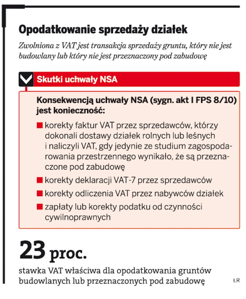 Skutkiem uchwały NSA jest konieczność korygowania rozliczeń. Jak tłumaczy Beata Hudziak, podatnicy którzy po 30 kwietnia 2004 r., kiedy zaczęła obowiązywać nowa ustawa o VAT, sprzedawali grunt zakwalifikowany w ewidencji gruntów i budynków jako użytek rolny lub grunt leśny, powinni zweryfikować dokonane rozliczenia. Jeżeli od takiej transakcji sprzedaży naliczyli VAT, powinni rozważyć skorygowanie faktury VAT, i potraktowanie sprzedaży jako zwolnionej z VAT.