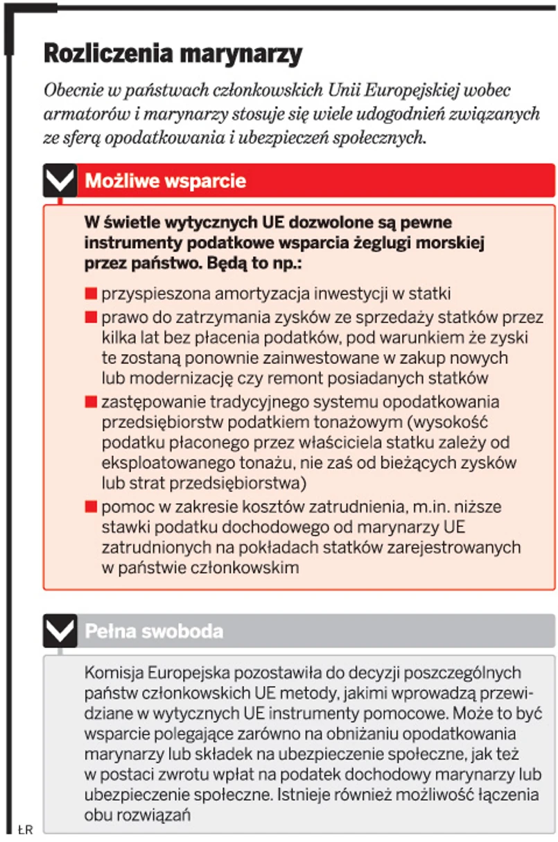 Dominika Dragan-Berestecka zauważa, że w uzasadnieniu do projektu wskazano, że zwolnienie części wynagrodzenia marynarzy z podatku dochodowego jest zgodne z punktem 11 wytycznych Wspólnoty w sprawie pomocy publicznej dla transportu morskiego (2004/C 13/03), który stanowi, że maksymalny poziom pomocy to zmniejszenie do zera opodatkowania dochodów marynarzy.