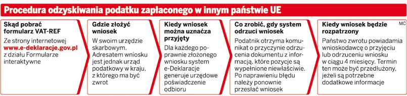 Kwestie związane z odzyskaniem podatku regulują przepisy ustawy z 11 marca 2004 r. o podatku od towarów i usług (Dz.U. nr 54, poz. 535 z późn. zm.) oraz wydane na jej podstawie rozporządzenie ministra finansów z 24 grudnia 2009 r. w sprawie wniosków o zwrot podatku od wartości dodanej naliczonego w innym niż Rzeczpospolita Polska państwie członkowskim Wspólnoty Europejskiej (Dz.U. nr 224, poz. 1800 z późn. zm.). Zgodnie z nimi wniosek o zwrot składa się wyłącznie w formie elektronicznej (formularz VAT-REF) do naczelnika urzędu skarbowego.