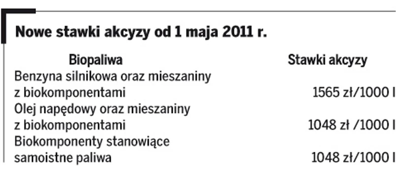 Od 1 maja 2011 r. zostaną podwyższone stawki podatku akcyzowego dla benzyn silnikowych, olejów napędowych zawierających biokomponenty oraz dla samych biokomponentów stanowiących samoistne paliwa. Ustawodawca likwiduje ulgi akcyzowe z tytułu zawartości biokomponentów w paliwach. Jednocześnie od 1 maja, jednak nie wcześniej niż od dnia ogłoszenia zgody Komisji Europejskiej o zgodności pomocy publicznej ze wspólnym rynkiem, do 31 grudnia 2011 r. wprowadzono ulgi akcyzowe dla benzyn i paliw zawierających powyżej 80 proc. biokomponentów oraz dla biokomponentów stanowiących samoistne paliwa.