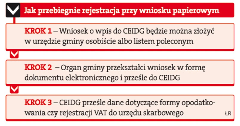 Przypomnijmy, że po zmianie przepisów zasadą ma być składanie przez osoby fizyczne wniosków o wpis do CEIDG za pośrednictwem formularza elektronicznego dostępnego na stronie internetowej CEIDG. Jednak przedsiębiorca będzie mógł złożyć wniosek także osobiście lub listem poleconym w wybranym urzędzie gminy.