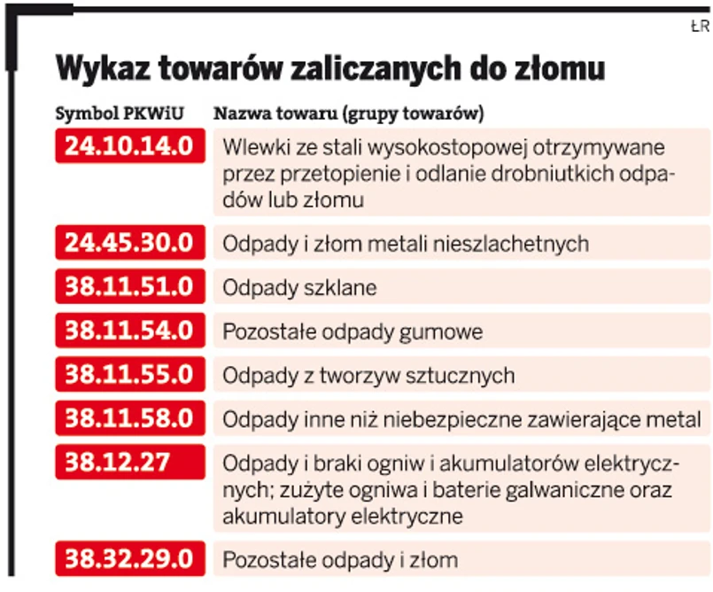 Katalog odpadów przetwarzalnych objęty samonaliczaniem VAT skonstruowany został na zasadzie odwołań do Polskiej Klasyfikacji Wyrobów i Usług (PKWiU). Agnieszka Bieńkowska, doradca podatkowy i partner w MDDP, zwraca uwagę, że o ile w majowej interpretacji ogólnej minister finansów próbując nakreślić definicję złomu, odniósł się do pojęć funkcjonujących już wcześniej w ustawie o VAT bez ich dodatkowego wyjaśniania czy doprecyzowania (takich jak złom stalowy, wsadowy i niewsadowy, złom żeliwny, złom metali nieżelaznych czy metali szlachetnych), o tyle w nowym załączniku nr 11 klasyfikację danego towaru jako złom uzależniono wprost od symbolu PKWiU.