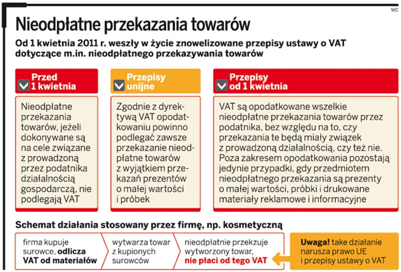 Przed 1 kwietnia 2011 r. przepisy o VAT odnosiły się wyłącznie do czynności „nieodpłatnego przekazania towarów”. Nieważne było źródło ich pochodzenia. Ale przepisy nie mówiły też nic o tym, że dotyczy to „wydania towaru”, gdy związane jest to z prowadzeniem przedsiębiorstwa. To – według Andrzeja Pośniaka – powodowało, że powstała luka, skutkiem której wydanie towarów związanych z prowadzeniem przedsiębiorstwa nie podlegało VAT. Ustawodawca dostrzegł ten błąd i zmienił przepisy w ramach kwietniowej nowelizacji.