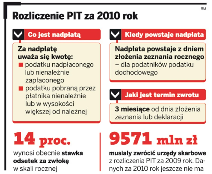 – Skoro zeznanie podatnika za 2010 rok wpłynęło do organu podatkowego 2 maja 2011 r., 3-miesięczny termin zwrotu nadpłaty upłynie 2 sierpnia 2011 r. – potwierdza Wiesława Dróżdż z Ministerstwa Finansów.