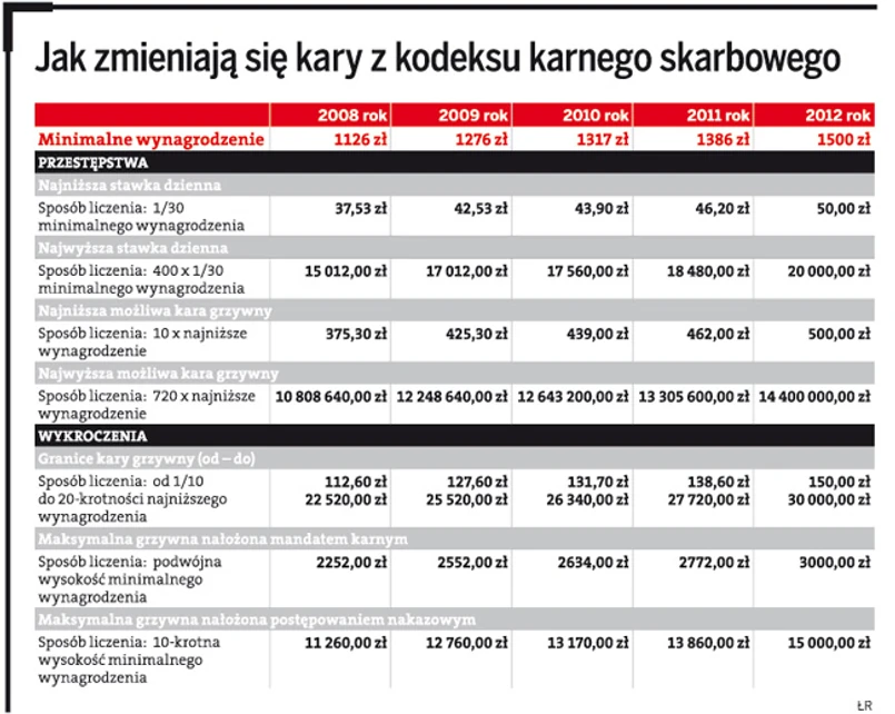 Ten gwałtowny wzrost kar to wynik czekającego nas od 1 stycznia 2012 r. podniesienia płacy minimalnej z obecnych 1386 zł do 1500 zł. Co prawda w ramach Komisji Trójstronnej nie udało się dojść do porozumienia co do jej wysokości, jednak taka kwota jest już przesądzona. Minimalne wynagrodzenie ma szerokie zastosowanie w przepisach kodeksu karnego skarbowego. Za pomocą tego wskaźnika określana jest wysokość kar grzywny za przestępstwa i wykroczenia skarbowe. Ma on również wpływ na wyznaczenie granicy między wykroczeniem a przestępstwem skarbowym.