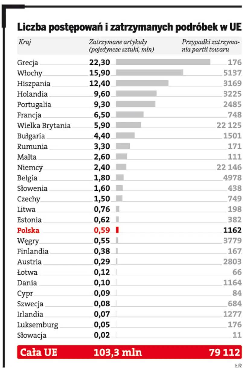 Z raportu Komisji wynika, że polscy celnicy wszczęli postępowania w 1162 sprawach i zatrzymali 590 tys. artykułów. Biorąc pod uwagę liczbę zatrzymanych artykułów, Polska jest na 17. miejscu. Zdaniem Zbigniewa Liptaka, starszego menadżera w Ernst & Young, ten wynik nie świadczy o tym, że polska Służba Celna jest nieskuteczna. To raczej skutek specyficznej sytuacji gospodarczej.