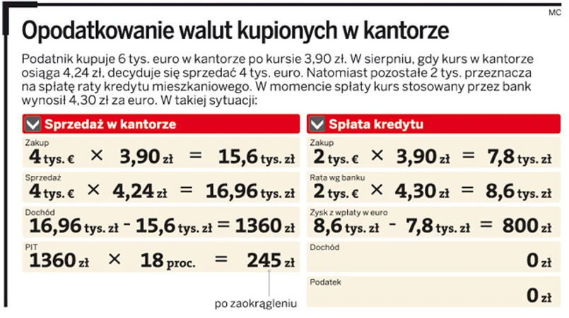 Nasz rozmówca rzeczywiście ma powody do zadowolenia. Zakładając, że kupił obie waluty 3 stycznia 2011 r., za franki (biorąc pod uwagę kurs średni NBP) zapłacił 31 790 zł (10 tys. x 3,1790 zł). Za euro dał 39 622 zł (10 tys. x 3,9622). Jeśli zdecydował się na sprzedaż 11 sierpnia, to na franku zarobił 7772 zł (kurs średni NBP 3,9562 zł), a na euro 1983 zł (kurs średni NBP 4,1605 zł). Całkowity zysk na tej operacji to: 9755 zł. W rzeczywistości, jeśli liczyć wszystko według kursów kantorowych, zysk może okazać się jeszcze wyższy. Radość z udanej inwestycji może jednak popsuć świadomość, że tym zyskiem trzeba będzie podzielić się z fiskusem. A o tym nie każdy wie albo nie każdy chce pamiętać.