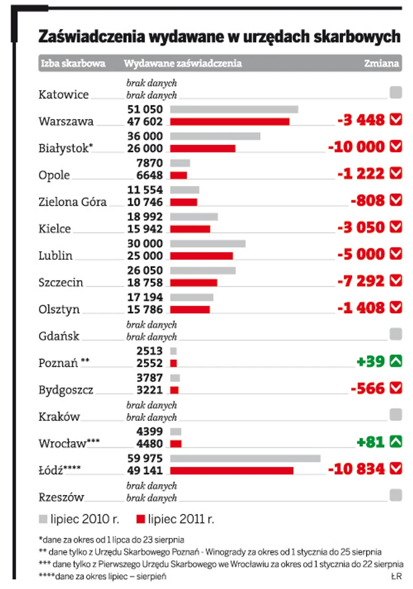 Podobnie jest w całej Polsce. Przykładowo Andrzej Pieczko z Izby Skarbowej w Zielonej Górze podaje, że w sześciu urzędach skarbowych woj. lubuskiego liczba wydanych zaświadczeń spadła (porównując