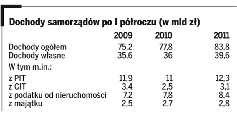 Dochody jednostek samorządowych po I półroczu wyniosły 83,8 mld zł, co oznacza, że trafiło do nich 47,2 proc. dochodów zaplanowanych na cały 2011 r. Jak poinformował resort finansów w porównaniu do I półrocza poprzedniego roku dochody samorządów wzrosły o 7,8 proc. Jeszcze wyższy wzrost (o 9,8 proc.) dotyczy dochodów własnych samorządów. W przypadku gmin do tej kategorii dochodów zalicza się m.in. wpływy z podatku od nieruchomości, rolnego, leśnego, opłat (targowej, skarbowej, miejscowej, uzdrowiskowej, od posiadania psów i in.), a także np. dochody z majątku gminy.