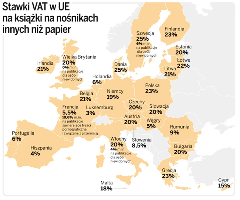 Z tego względu niektóre kraje unijne buntują się przeciwko takim regulacjom. Zapowiadają one, wbrew przepisom UE, zrównanie stawek podatku od towarów i usług na książki. Niezależnie od formy ich udostępniania czytelnikom.