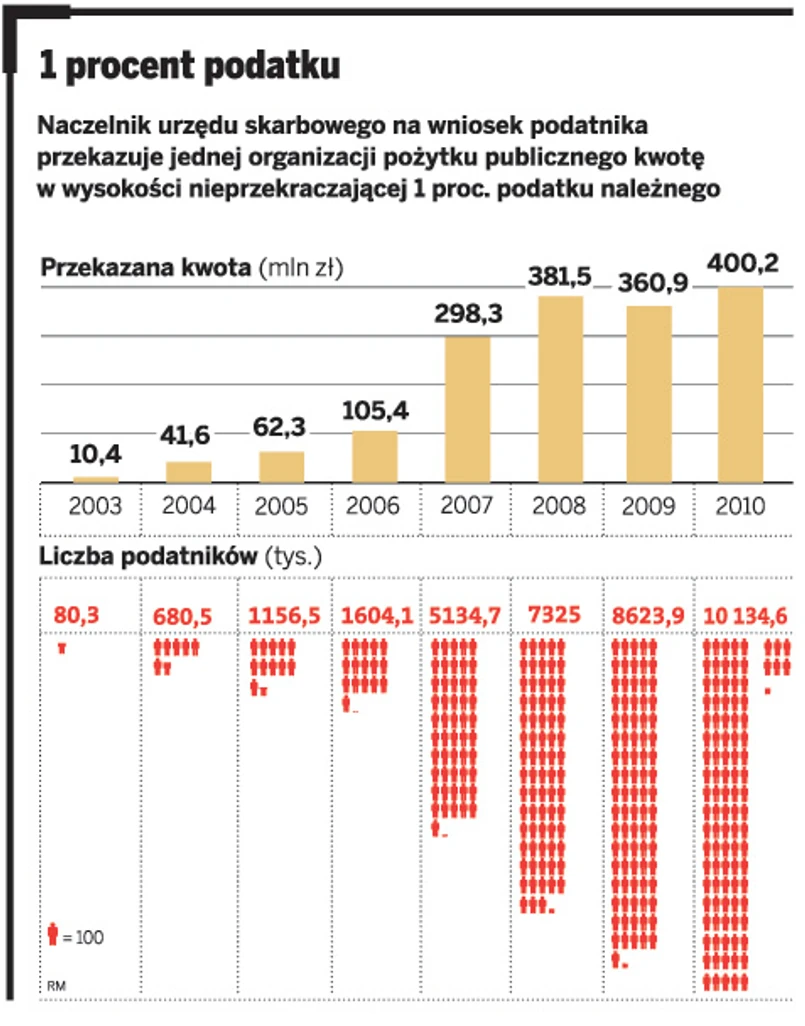 Przypomnijmy, że w pierwszym roku obowiązywania regulacji o przekazywaniu organizacjom pożytku publicznego 1 proc. podatku zaledwie ponad 80 tys. podatników przekazało organizacjom 10,4 mln zł. W kolejnym roku uczyniło to już ponad 680 tys. podatników, a kwota przekazana wzrosła do 41,6 mln zł.