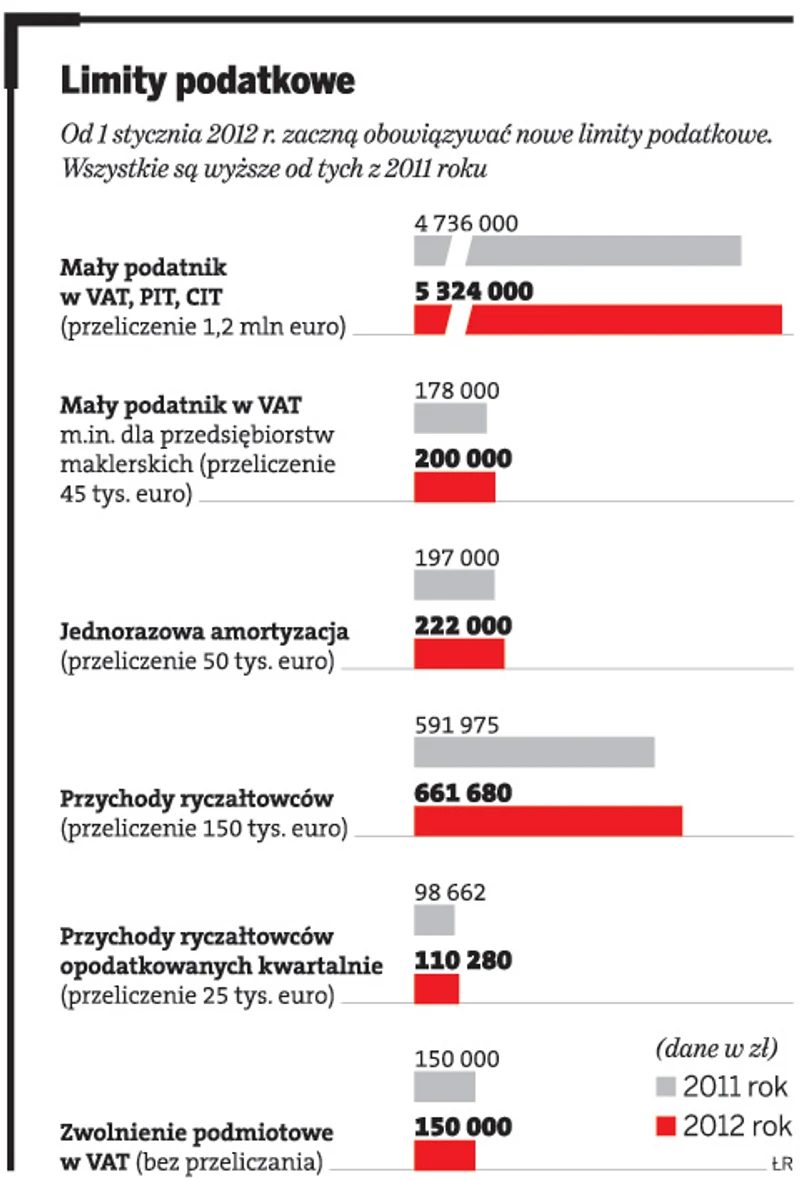 Również ustawy o podatkach dochodowych – ustawa o PIT i ustawa o CIT – przewidują limity dla małych podatników określone w euro. Podobnie jak w VAT limit ten obecnie wynosi 1,2 mln euro. Po przeliczeniu go na złote według średniego kursu euro ogłaszanego przez NBP na pierwszy dzień roboczy października poprzedniego roku podatkowego w zaokrągleniu do 1 tys. zł od 1 stycznia 2012 r. małym podatnikiem będzie podatnik, u którego wartość przychodu ze sprzedaży (wraz z kwotą należnego podatku od towarów i usług) nie przekroczyła w poprzednim roku podatkowym 5 324 000 zł. W 2011 roku limit ten wynosi 4 736 000 zł.