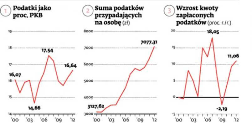 Licząc od roku 2000 do dziś, suma płaconych przez statystycznego Polaka podatków wzrosła z nieco ponad 3,1 tys. zł rocznie do niemal 6,4 tys. zł w tym roku.