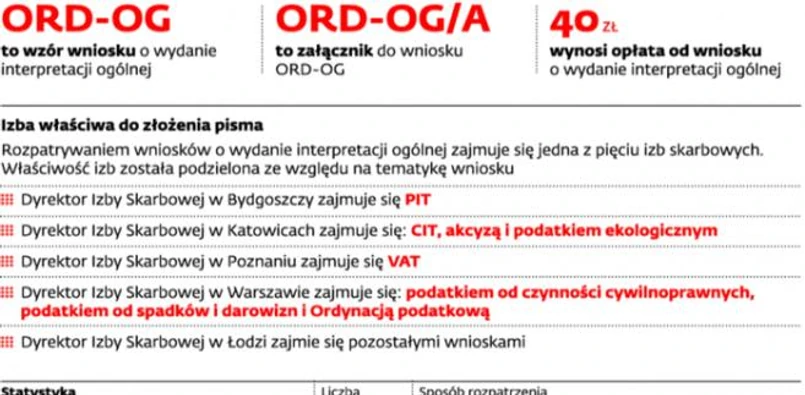 Dotychczas jeden wniosek o wydanie interpretacji ogólnej został rozpatrzony pozytywnie, w wyniku czego 27 kwietnia 2012 r. zostało wydane pismo nr DD5/033/2/DZQ/2012/DD-134 w zakresie podatku dochodowego od osób prawnych. Interpretacja ta dotyczyła powstania przychodu w związku z nieodpłatnym poręczeniem przez udziałowca pożyczki udzielonej spółce kapitałowej. Gdy nie są spełnione warunki do wydania interpretacji ogólnej określone w Ordynacji podatkowej lub gdy wniosek nie spełnia innych wymogów określonych przepisami, lub gdy przedstawione we wniosku zagadnienie jest przedmiotem interpretacji ogólnej i stan prawny nie uległ zmianie, wydawane jest postanowienie o pozostawieniu wniosku bez rozpatrzenia. W toku prowadzonego postępowania wyjaśniającego często okazuje się, że obarczone są one wadami formalnymi oraz wymagają uzupełnienia. Zdarza się też, że wnioski o wydanie interpretacji indywidualnej wnioskodawcy pomyłkowo składane są na druku ORD-OG (dotyczącym interpretacji ogólnej). Ponadto w części składanych pism brak jest wskazania niejednolitego stosowania przepisów prawa podatkowego, jak również uzasadnienia potrzeby wydania interpretacji ogólnej.