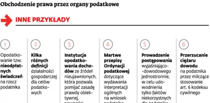 Z kolei zdaniem prof. Bogumiła Brzezińskiego, kierownika Katedry Prawa Finansów Publicznych Uniwersytetu Mikołaja Kopernika w Toruniu i kierownika Zakładu Prawa Finansowego Uniwersytetu Jagiellońskiego, są dwie klasyczne sytuacje obejścia prawa przez organy podatkowe.