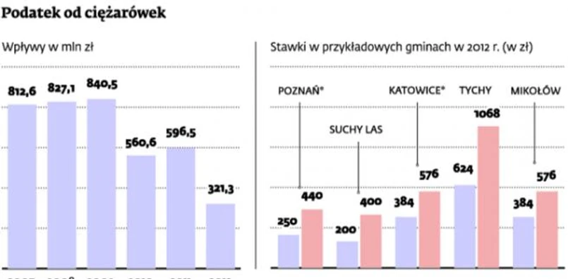 Wśród samorządowców głośna była niedawno sprawa Poznania, który stracił wielu podatników z branży transportowej. Najgorszy był rok 2010, kiedy odnotowano największą różnicę między liczbą pojazdów ciężarowych zarejestrowanych (478) a wyrejestrowanych (1561). Poznań przeanalizował sytuację. Okazało się, że zdecydowanie niższe stawki podatku od środków transportowych dla samochodów ciężarowych o masie powyżej 3,5 t, a mniejszej niż 12 t, miała pobliska gmina Suchy Las. Dzięki temu przedsiębiorcy chętnie tworzyli na jej terenie oddziały i rejestrowali pojazdy. W efekcie jej dochody wzrosły z ok. 6 mln zł w 2007 r. do 12,6 mln zł w 2010 r.