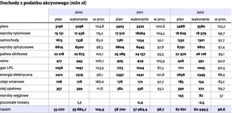 W ubiegłym roku do budżetu trafiło ponad 60 mld zł z akcyzy. To prawie o 2,2 mld zł mniej niż wynosiły plany. Takie dane przedstawiło Ministerstwo Finansów w opublikowanym właśnie Biuletynie Statystycznym Służby Celnej za 2012 r.