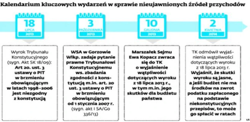 Z informacji DGP zebranych w izbach skarbowych w Katowicach, Szczecinie i Gdańsku wynika, że organy podatkowe obecnie prowadzą postępowania w sprawie nieujawnionych źródeł przychodów za rok 2007 i lata następne. Ministerstwo Finansów uważa, że obecny art. 20 ust. 3 ustawy o PIT powinien być stosowany, mimo że niespełna rok temu Trybunał Konstytucyjny uznał za niekonstytucyjny analogiczny przepis obowiązujący w okresie od 1998 r. do końca 2006 r. (wyrok z 18 lipca 2013 r., sygn. akt SK 18/09).