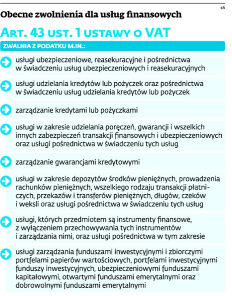 Pozostałyby natomiast zwolnienia przewidziane dla usług finansowych (patrz ramka). Dotyczą one m.in.: udzielania kredytów lub pożyczek pieniężnych oraz usługi pośrednictwa w świadczeniu usług udzielania kredytów lub pożyczek pieniężnych, a także zarządzania kredytami lub pożyczkami pieniężnymi przez kredytodawcę lub pożyczkodawcę.