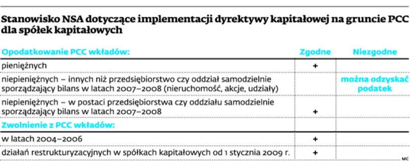 Z innych orzeczeń wynika jednak, że stanowisko NSA w tej kwestii jest jasne – opodatkowanie PCC większości wkładów wnoszonych do spółek kapitałowych, w tym zwłaszcza wkładów pieniężnych, jest zgodne z unijną dyrektywą.