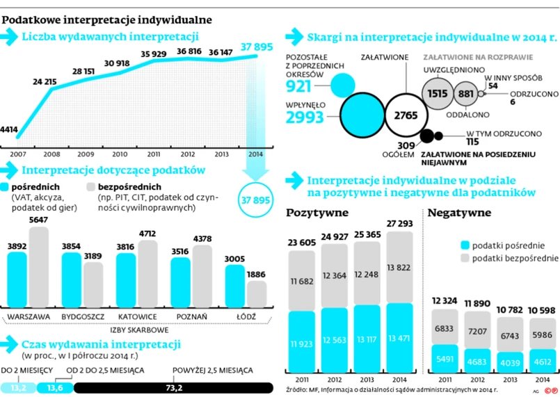 Negatywnych interpretacji było w 2014 r. zaledwie 28 proc. (ok. 10,6 tys.). Z reguły podatnicy zaskarżają je do sądów, w wielu przypadkach – skutecznie. Z „Informacji o działalności sądów administracyjnych w 2014 r.” wynika, że w ubiegłym roku wojewódzkie sądy uwzględniły ponad 1,5 tys. skarg na interpretacje wydawane przez izby skarbowe (pomijamy wykładnię wójtów, burmistrzów i prezydentów miast).