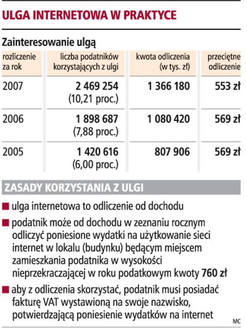 Ulga internetowa jest jedną z najbardziej popularnych ulg podatkowych. W rozliczeniu za 2007 rok skorzystało z niej prawie 11 proc. wszystkich podatników PIT. Według Dominiki Dragan-Beresteckiej, doradcy podatkowego w kancelarii podatkowej Ożóg i Wspólnicy, zniesienie ograniczenia w postaci kwoty granicznej 760 zł z pewnością ucieszyłoby wielu internautów. W większości przypadków faktury za korzystanie z dostępu do internetu przekraczają rocznie 760 zł i wiele osób chętnie pomniejszyłoby swój dochód o większą kwotę.