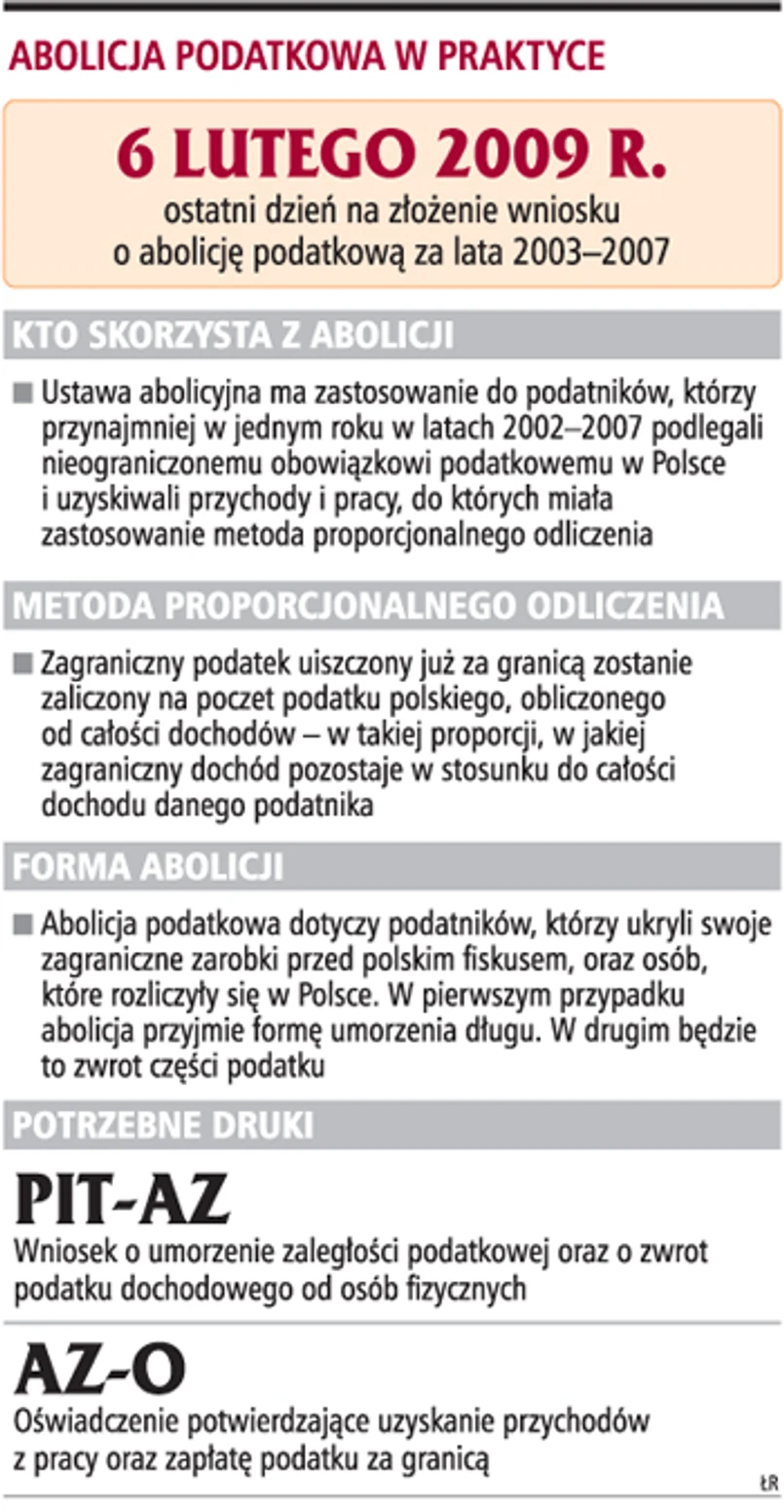Do 6 października mogli składać wnioski o udzielenie abolicji, podatnicy, którzy uzyskali dochody za granicą w 2002 roku. Z możliwości tej skorzystało niewiele osób. W większości województw liczba wniosków abolicyjnych za 2002 rok nie przekroczyła 20. Przeważają tu wnioski o umorzenie długu wobec fiskusa. Większe zainteresowanie abolicją dotyczy lat 2003-2007, ale tu większą część stanowią wnioski o zwrot części PIT. Tych wniosków w każdym województwie jest już po kilkaset. Takie informacje otrzymaliśmy z izb skarbowych.