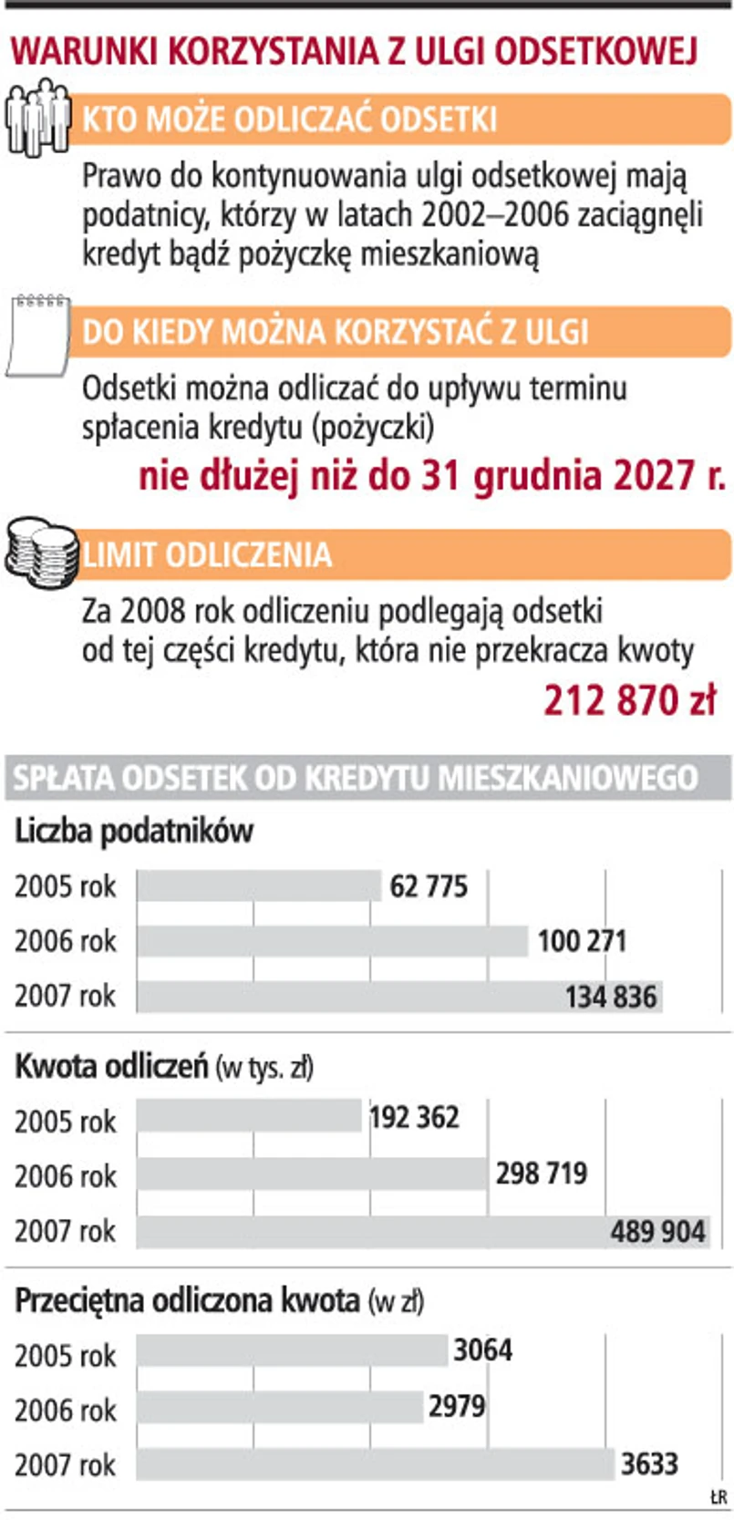 Przypomnijmy, ulga odsetkowa zniknęła z ustawy o podatku dochodowym od osób fizycznych z początkiem 2007 roku. Ustawodawca zagwarantował podatnikom, którzy w odpowiednim czasie zaciągnęli kredyt (pożyczkę) mieszkaniową, prawo do kontynuacji odliczeń.