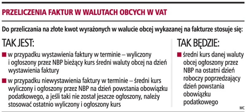 Ekspert wyjaśnia, że kwoty te przelicza się na złote według kursu średniego waluty obcej wyliczonego i ogłoszonego przez NBP na dzień wystawienia faktury. Natomiast w podatkach dochodowych przeliczanie przychodów i kosztów wyrażonych w walucie obcej następuje według kursu średniego NBP ogłoszonego na dzień poprzedzający moment uzyskania przychodu lub poniesienia kosztu. Nowelizacja ustawy o VAT ma na celu usunięcie tych rozbieżności.