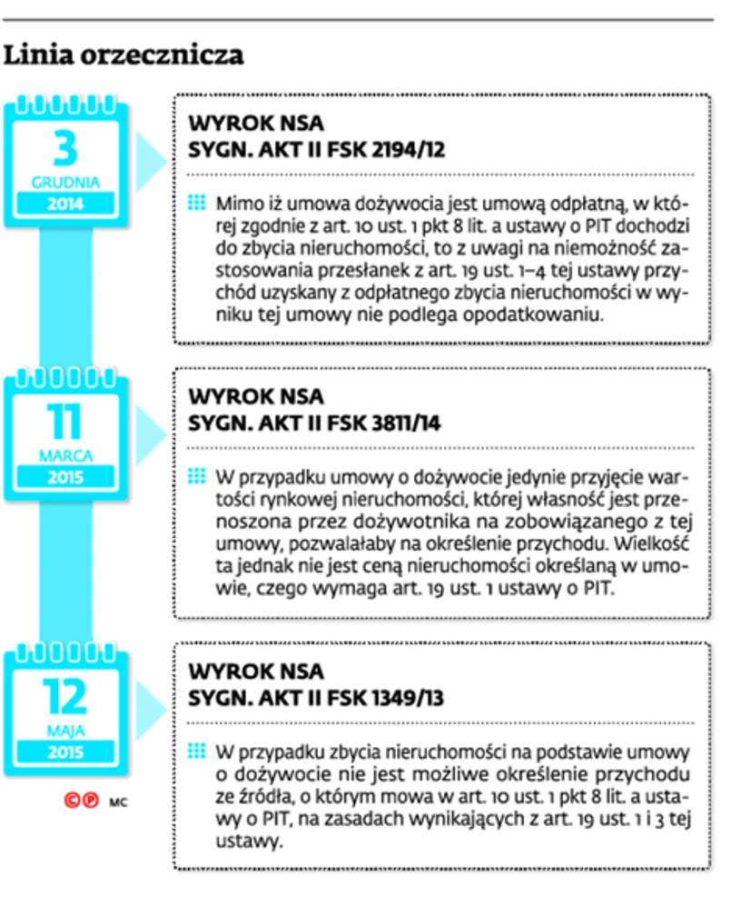 Kwestia opodatkowania dochodu z tytułu zbycia nieruchomości w drodze umowy dożywocia była przedmiotem orzecznictwa sądów administracyjnych, które nie było jednolite. Wobec tego Naczelny Sąd Administracyjny w składzie 7 sędziów, podjął 17 listopada 2014 r. uchwałę (sygn. akt II FPS 4/14), w myśl której „w przypadku zbycia nieruchomości na podstawie umowy o dożywocie nie jest możliwe określenie przychodu ze źródła, o którym mowa w art. 10 ust. 1 pkt 8 lit. a ustawy o PIT (...), na zasadach wynikających z art. 19 ust. 1 i 3 tej ustawy”.