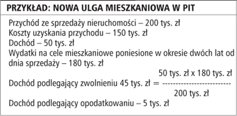 Zgodnie z projektem, jeżeli począwszy od dnia odpłatnego zbycia nieruchomości, nie później niż w okresie dwóch lat od końca roku podatkowego, w którym nastąpiło odpłatne zbycie, podatnik przeznaczy przychód uzyskany z tego zbycia na określone w ustawie własne cele mieszkaniowe, część przychodu ze sprzedaży będzie podlegała zwolnieniu z opodatkowania.
