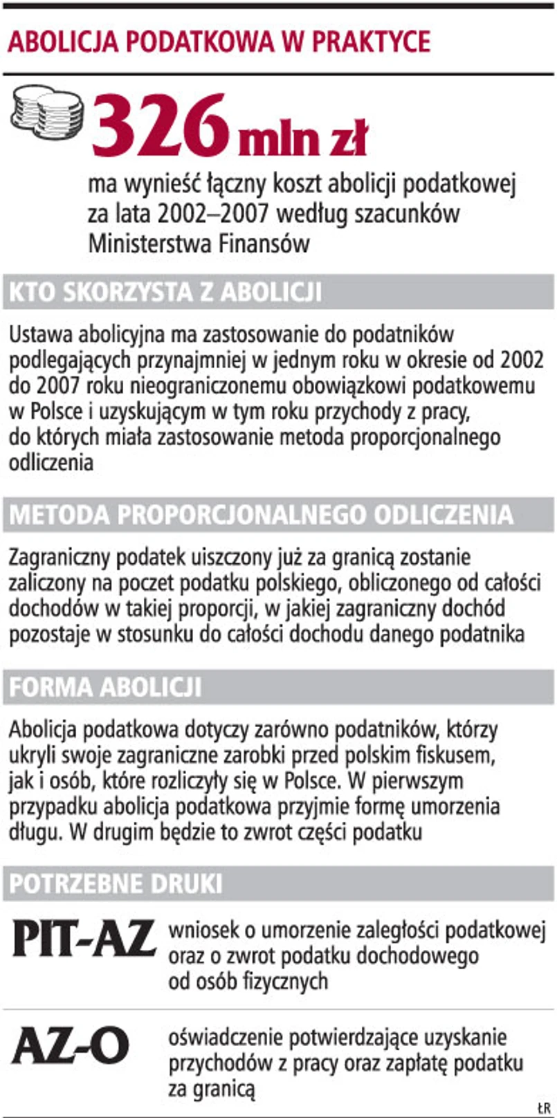 Z abolicji podatkowej mogą skorzystać podatnicy zarabiający za granicą w latach 2002-2007 (termin na złożenie wniosku o abolicję za 2002 rok minął 6 października). Dotyczy to zarówno podatników, którzy nie rozliczyli w Polsce zagranicznych zarobków, a mieli taki obowiązek, jak i osób, które w krajowym urzędzie skarbowym wykazały wszystkie zarobki i teraz mogą starać się o zwrot części podatku. Niestety, z dobrodziejstw abolicji nie skorzystają wszyscy. Tej możliwości nie będą mieć podatnicy, którzy robili wszystko, aby uniknąć płacenia podatku w Polsce.