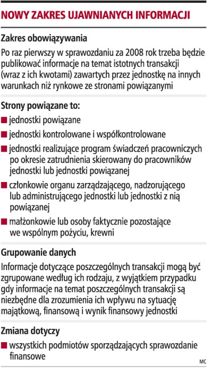 Publikacja w sprawozdaniu finansowym danych o transakcjach przeprowadzonych na nierynkowych warunkach może sprowadzić na spółkę kontrolę z urzędu skarbowego lub urzędu kontroli skarbowej. Ujawnianie w informacji dodatkowej do sprawozdania tego typu transakcji przeprowadzonych ze stronami powiązanymi wymagają przepisy znowelizowanej 18 marca 2008 r. ustawy o rachunkowości. Mają one zastosowanie po raz pierwszy do sprawozdania za 2008 rok. Za strony powiązane są uważane nie tylko jednostki powiązane, ale też członkowie zarządu oraz ich rodziny.