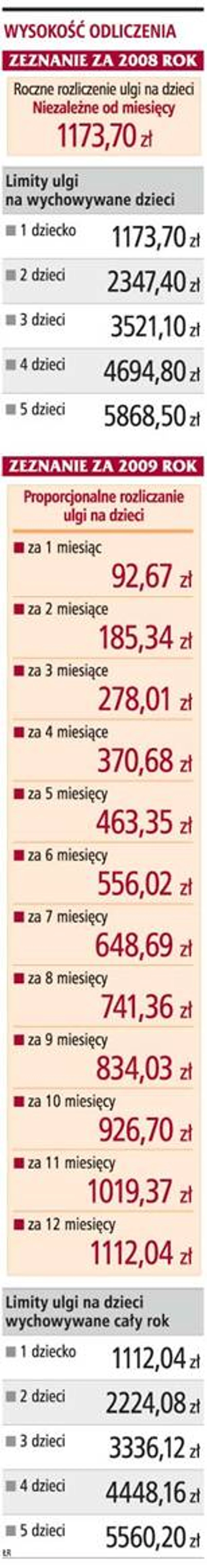 Ulga na dziecko od 2009 roku będzie przysługiwała za miesiące, w których podatnik w stosunku do dziecka wykonywał władzę rodzicielską, pełnił funkcję opiekuna prawnego albo rodziny zastępczej. W tej sytuacji kwota ulgi za każdy miesiąc wyniesie 1/6 kwoty zmniejszającej podatek, o której mowa w pierwszym przedziale skali podatkowej, czyli w 2009 roku 92,67 zł (1/6 z 556,02 zł).